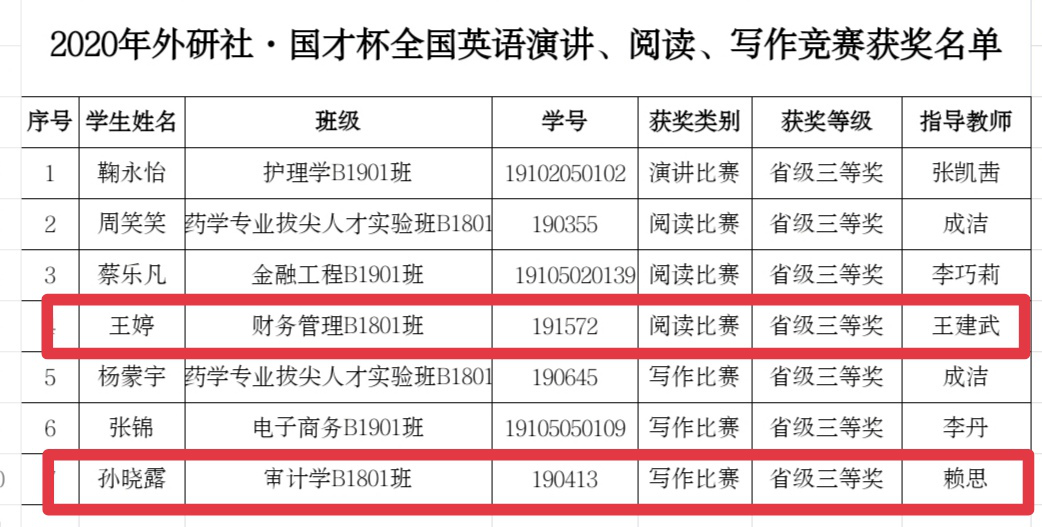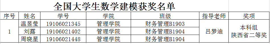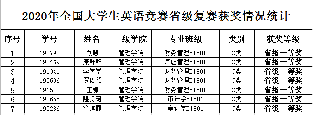 管理学院学子在全国大学生英语竞赛、数学建模大赛中连获佳绩,共有30多位同学获得此项奖励,其中财管B1801刘慧、罗珺颖、李学学、王婷,酒管B1801康群群,审计B1801隆猗珂、简琪霞同学获得省级一等奖,尤其是财务管理B1801拔尖人才创新班和审计B1801班作为管理学院优良学风班,积极主动带动全院优良学风的形成,学生们吃苦耐劳,深刻落实“书山有路勤为径”的古训;师生配合默契,相互信任,稳扎稳打,相互配合,在全国大学生英语竞赛、数学建模大赛中证明自己的努力,获得了不菲的成绩。