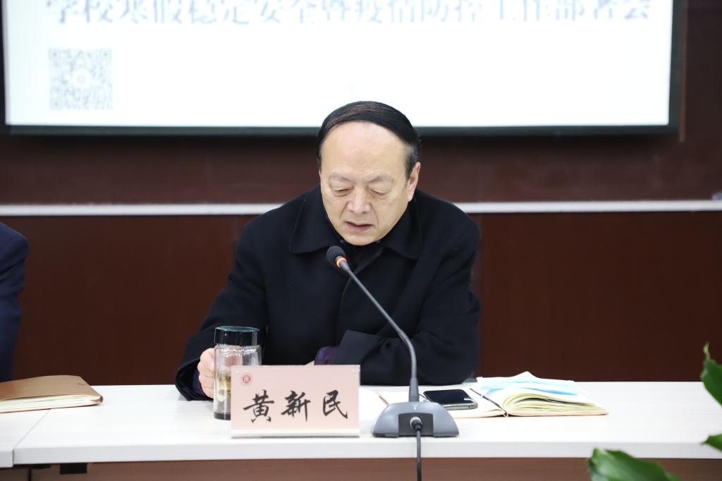 校长黄新民做了四点要求,一是要提高政治站位,强化责任意识。把安全稳定和疫情防控工作作为学校的头等大事,严格按照省、校疫情防控工作要求,做好每一项工作;二是要加强学校假期安全稳定工作。从值班、学校重点区域拉网式排查、利用网络媒体进行安全宣传等方面做了要求;三是切实做好疫情防控工作。各部门要切实把校园疫情防控安全作为一项政治任务抓好、抓实,严格校园出入管理制度,严格打卡信息上报,严格审批各类会议出差,严格聚集性活动管理,严格校园安全、消防安全、食品卫生安全管理工作,科学安排好下学期学生错峰开学的准备工作,做好各类突发应急工作预案;四是提前谋划,明确任务,确保工作扎实推进。各部门、各单位假期工作要有方案、有备案、措施落实到位,责任落实到人。