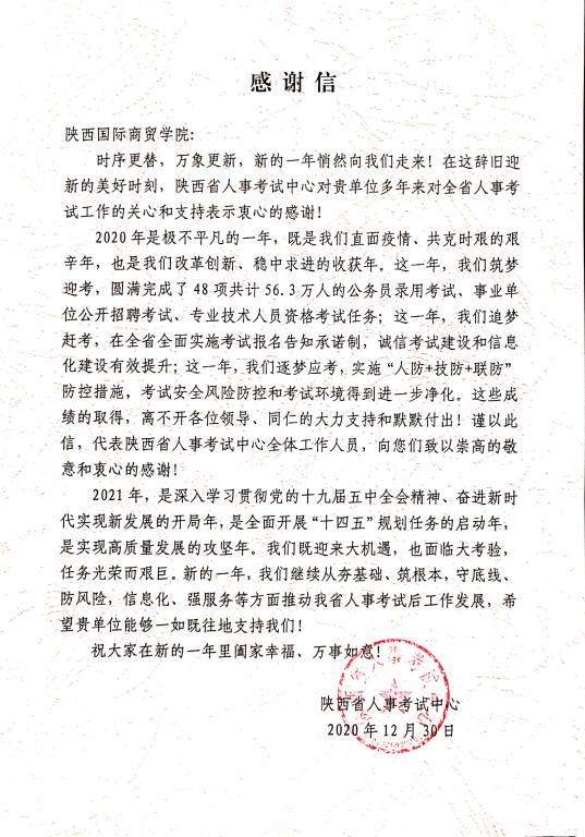 本网讯 近日,陕西省人事考试中心结合各个考点全年日常考试组织情况等,对各考点进行综合考评,评选出表现优秀的考点进行表彰。我校获评陕西省人事考试中心“优秀考点”荣誉称号,这也是对我校承接社会考试工作所给予的充分肯定。