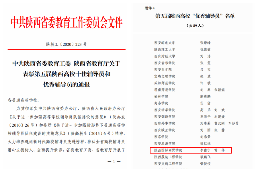 “十三五”期间,学院立足专业特色,秉承“学生为中心”的宗旨,以“立德树人”为根本任务,建立了“班级学业导师‘1+1’、专职教师‘1+2’、行政干部‘1+10’”的育人体系,构建了“社会—学校—家庭—学生”四位一体的育人模式,依托“四个模范三个一工程”开展学生思想政治教育工作。打造“‘悦享ING’读书栏目、‘双百工程’”等品牌活动,优化学风建设、促进学院优良学风的形成。近年来,学院学生考研率、四六级过关率和计算机通过率明显提升,考取硕士研究生16名,四六级、计算机过关率位居全校前列;学院通过组织科技竞赛月、第二课堂和暑期社会实践等活动,学生共获得省级以上科技竞赛一等奖55人、二等奖112人、三等奖278人;学科竞赛获省级一等奖31人、二等奖42人、三等奖56人。其中,获全国大学生互联网+大赛陕西赛区一等奖1项,二等奖1项,三等奖2项,“挑战杯”陕西省大学生课外学术科技作品竞赛一等奖1项,二等奖3项,三等奖4项;大学生暑期社会实践调研队连续5年荣获“省级优秀团队”,2名学生获评“省级社会实践先进个人”;2019年学院推送的《读书遇见更好的自己》荣获“第四届陕西省高校心理育人百家慕课心悦读大赛一等奖”。育人效果和学生能力提升成绩显著。