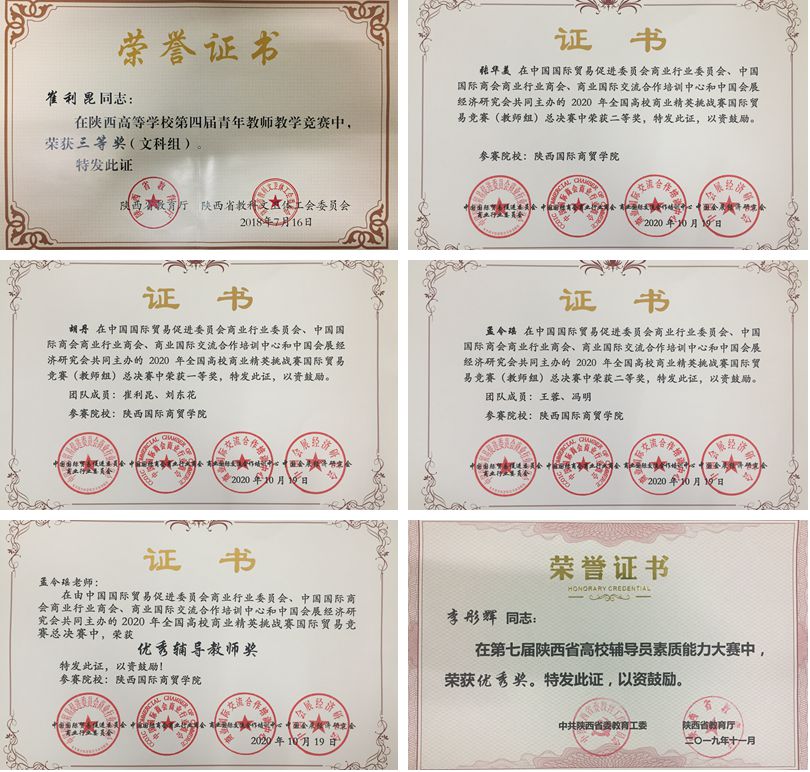 教师是立教之本、兴教之源。学院遵循“引育并举”,重点引进高层次人才和优秀青年教师,加强师资队伍建设。多举措开展教师学历、实践能力和国内外培养提升教师综合实力;坚持以赛促教、强化激励,优化绩效考核,不断促进教师教学能力提升和工作活力。“十三五”期间,国际经济学院引进青年教师10人,其中博士1人。5名教师晋升副教授职称,4名教师正在攻读博士学历,3名教师作为访问学者进行交流培养,19名教师赴企业实践进修。一批优秀教师分别荣获“校级教学名师”、“陕西省高等学校第四届青年教师教学竞赛中(文科组)三等奖”、“第五届陕西高校优秀辅导员”“全国高校商业精英挑战赛国际贸易竞赛教师组说课比赛一等奖1项、二等奖2项”、“应用型人才技能大赛‘国泰安•赛名师杯’教师创课大赛全国总决赛二等奖2项、三等奖2项”;在“校级讲课大赛”、“校级微课大赛”、“校级多媒体课件大赛”中荣获一等奖1项,二等奖5项,三等奖7项。