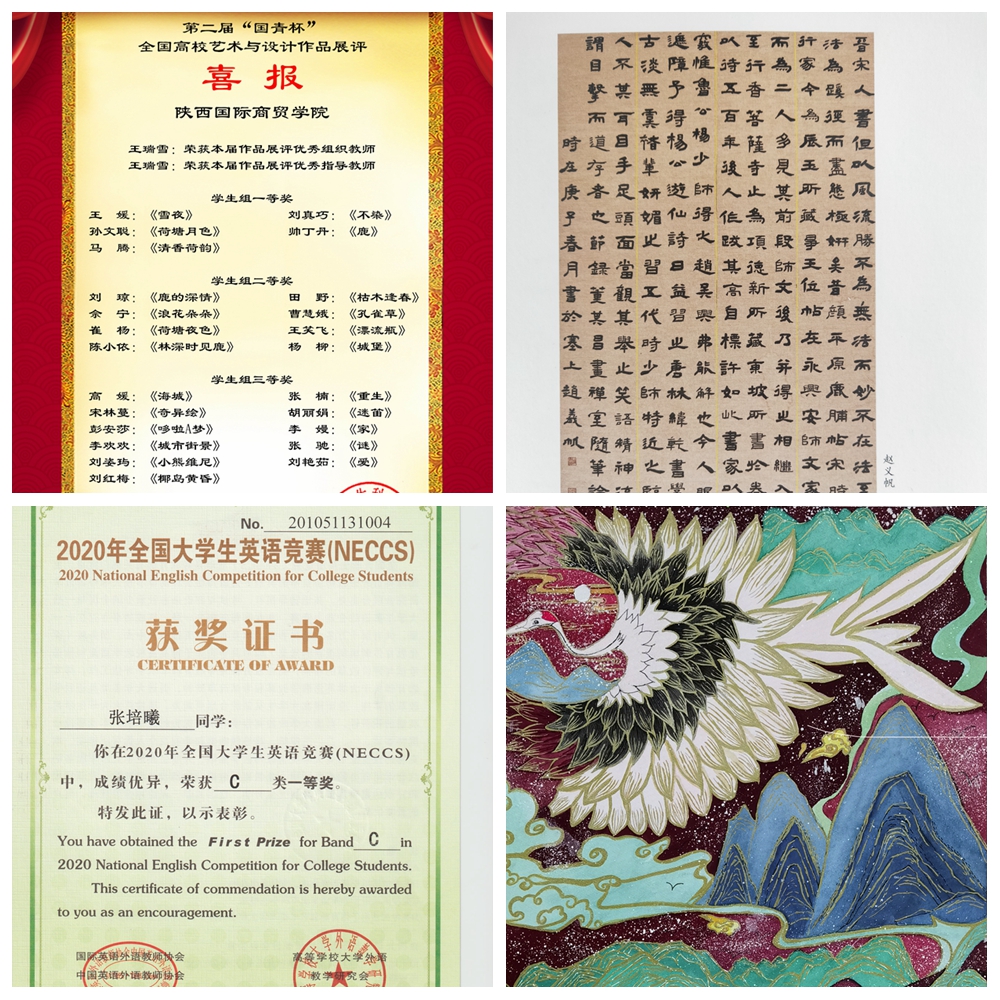 “十三五”期间,学院进一步明确人才培养目标与思路,坚持专业教育与创新创业教育融合发展,开展课程改革试点工作和“一专一品”活动,推动人才培养质量持续提升。近五年,学生获得各类竞赛国家级奖励达161项,省级奖励239项,市级奖励12项,共计达483人次。其中,2019年获第五届“建行杯”中国“互联网+”在学生创新创业大赛陕西赛区三等奖;第三届咸阳市科技创新创业大赛一等奖;2020年,2018级汉语言文学专业刘昊同学的书法作品《魏碑春秋繁露节录》被推荐入围教育部组织的全国大学生艺术展演,是全省民办院校中唯一获推荐教育部的奖项。五年来,学院累计培养毕业生1600余名,毕业生就业率均在95%以上,就业对口率逐年上升;考取硕士研究生人数逐年提升,就读高校包括美国纽约电影学院、上海师范大学、西安理工大学、辽宁大学等国内外知名学校。