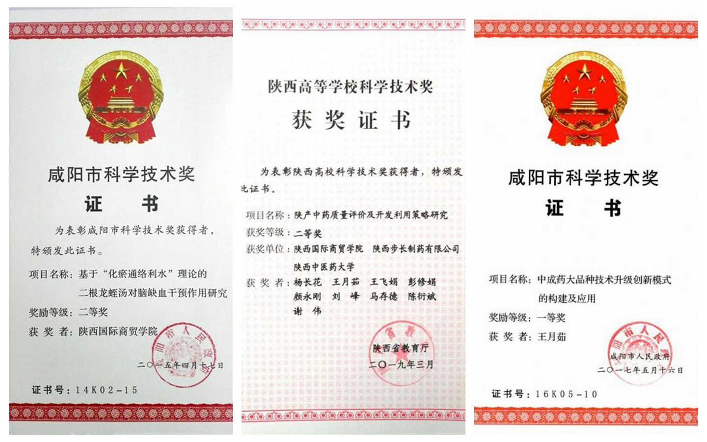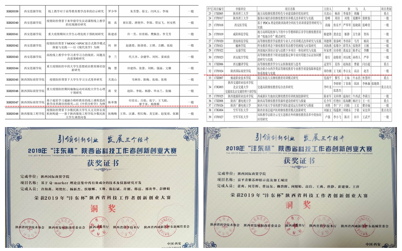 围绕行业发展战略需求和区域经济发展中的重大问题,以科研团队和平台建设为抓手全面提升我院科学研究水平,使科研更好的反哺教学。“十三五”期间,获批陕西省2011协同创新中心——中药绿色制造技术协同创新中心,陕西省首批院士专家工作站——生物医药创新制药技术研究院士专家工作站,陕西省中药制药关键技术重点研究室,陕西省创新药物研究中心,与西安社会科学研究院共建——西咸经济发展质量研究中心新型智库,陕西省高校哲学社会科学重点研究基地——健康文化研究中心,陕西省中药产业技术创新服务共享平台,共7个省级平台;获批咸阳市中药口服固体制剂工程技术研究中心1个市级平台。获批陕西高校青年创新团队——中药质量标志物发现及应用创新团队1个省级团队,咸阳市中药生产工艺与质量控制关键技术创新团队1个市级团队。截止“十三五”末,医药学院共拥有10个省级平台,3个市级平台,2个省级团队,1个市级团队。依托省市级平台和团队,教师共获批厅局级以上科研项目45项,其中省部级项目12项;承担横向科研项目65项,到账科研经费236.03万元;授权国家专利29项,其中发明专利2项;出版专著3部;发表科技论文227篇(其中SCI 收录12篇,EI收录8篇,CSCD收录35篇,中文核心收录22篇)。并取得省级科学技术进步三等奖1项,厅局级科学技术进步一等奖1项,二等奖2项,陕西省科技工作者创新创业大赛铜奖2项。
