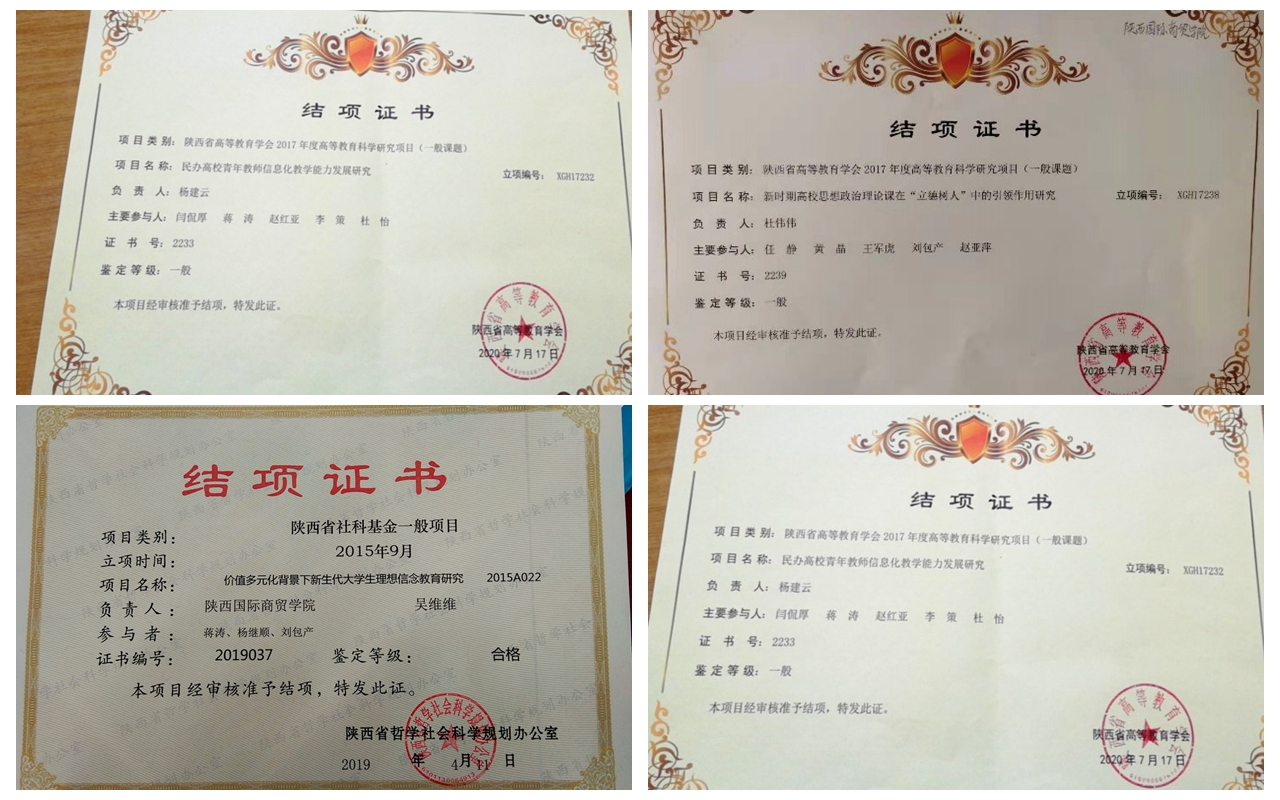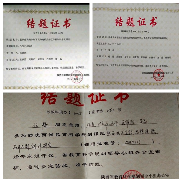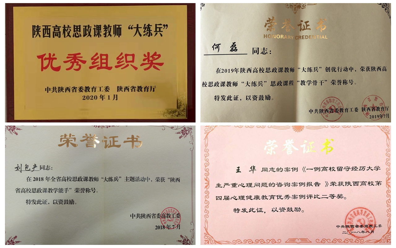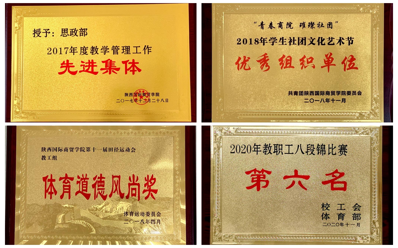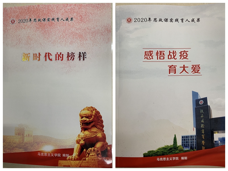 “十三五”期间,学院全面落实立德树人根本任务,树人以立德为先,不断推进思政课教学改革创新,提高思政课对学生的政治导向和价值引领作用。深化思想政治理论课综合改革,强化问题意识和团队攻关,注重发挥教与学两个积极性,形成第一课堂与第二课堂、理论教学与实践教学、课堂教学与网络教学相互支撑,理念手段先进、方式方法多样、组织管理高效的思想政治理论课教学体系,教学改革成果显著。“十三五”期间,学院共建设校级精品课程2门、在线课程2门,主持教学改革项目11项,其中省级项目5项,发表教改论文20余篇,获得2项教学成果奖。立足“思政+学院+专业”,以成果项目为抓手,探索思政课实践育人的新路径、新模式,挖掘思政课实践教学的新渠道和新方法,充分发挥实践教学的育人功能,产出一批充满陕商院特色的实践教学成果。2020年出版《感悟战疫育大爱》、《新时代的榜样》等学生实践成果。并在打造“3.25”—“5.25”心理健康宣传季品牌活动中,指导学生参加校园心理剧大赛,获得省级二等奖1项、三等奖2项的佳绩。