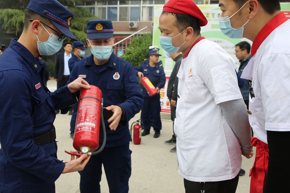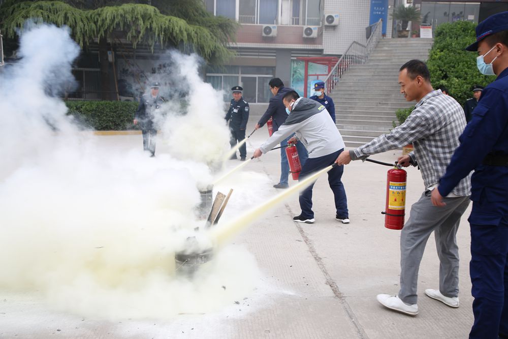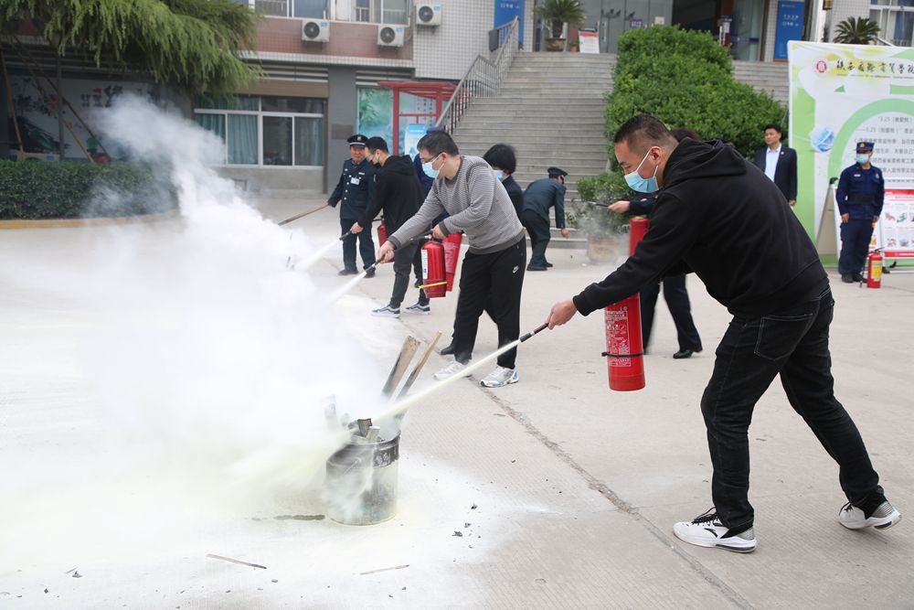 沣西新城消防救援大队的指战员向参训人员耐心地讲解、示范灭火器的使用方法和注意事项。各二级学院、职能处室的消防志愿者和义务消防队员依次利用灭火器进行实战灭火。