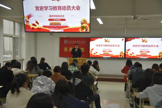 【医药学院】4月2日下午,医药学院党总支召开党员党史学习教育动员会,会议由学生党支部书记赵丹主持,党总支委员、支部书记及党员代表共80余人参会。