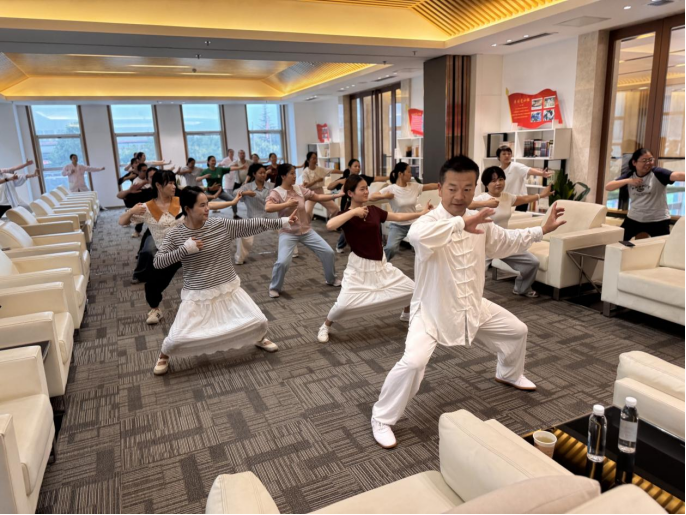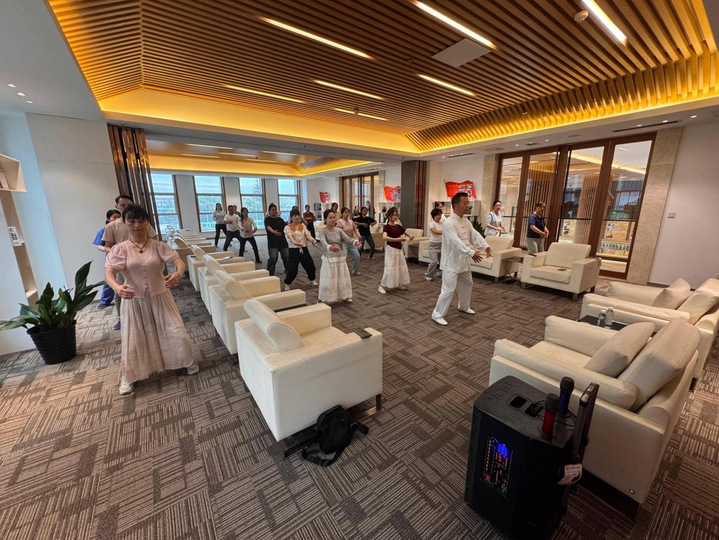 培训伊始,张川结合现代办公人群高发的颈肩腰不适等问题,生动讲解八段锦“松紧结合、动静相兼”的核心功法特点,系统阐释其改善身体机能、缓解工作疲劳的积极作用,帮助员工快速建立对传统功法的科学认知。进入实操教学环节后,张川采用“分解示范+逐式讲解+纠错指导”的方式,从“两手托天理三焦”至“背后七颠百病消”,逐一拆解动作要领;针对学员易出现的姿势偏差,进行手把手精准纠正,确保每位参与者都能准确掌握动作细节。本次培训全程2.5小时,现场学习氛围浓厚。尽管功法练习需兼顾精准度与协调性,但全体学员始终保持专注状态,认真跟随指导练习,反复揣摩动作精髓。培训结束后,员工们纷纷表示收获颇丰。“此前以为八段锦功法简单,实际学习后才发现蕴含诸多讲究,张老师的讲解既专业又实用,今后工作间隙就能随时练习”“练完后全身舒展不少,接下来会坚持用八段锦锻炼,以更健康的状态投入工作”。