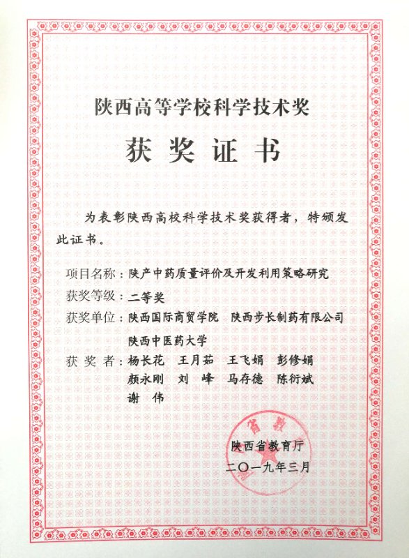 本网讯 近日,陕西省教育厅颁布了《2019陕西高等学校科学技术奖励的决定》(陕教〔2019〕40号),我校推荐的“陕产中药质量评价及开发利用策略研究”荣获陕西省科学技术奖(自然科学类)二等奖,这也是我校首次获得此项荣誉。 陕西省是中药资源大省,素有“秦地无闲草”之誉。该成果对陕产中药质量进行了系统评价,构建了陕产中药资源评价、人工种植、炮制加工、品质评价、功效成分、高效利用的研究开发策略体;创建了中药黄...
