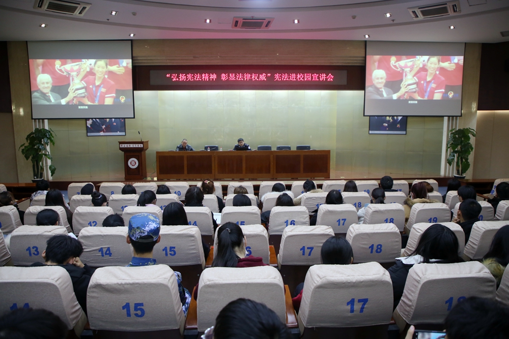本网讯 今年是我国第七个国家宪法日,为进一步学习贯彻党的十九届五中全会精神,增强师生法治观念,提高宪法意识,12月4日下午,我校联合西咸新区公安局沣西新城分局开展“弘扬宪法精神彰显法律权威”宪法进校园宣讲会,形成遵法、学法、守法、用法的浓厚校园氛围,深入推进“平安校园”建设。 保卫处处长汤唯主持宣讲会,西咸新区公安局沣西新城分局治安大队副大队长、区局法制支队民警张挺为师生做“弘扬宪法精神彰显法律权威...