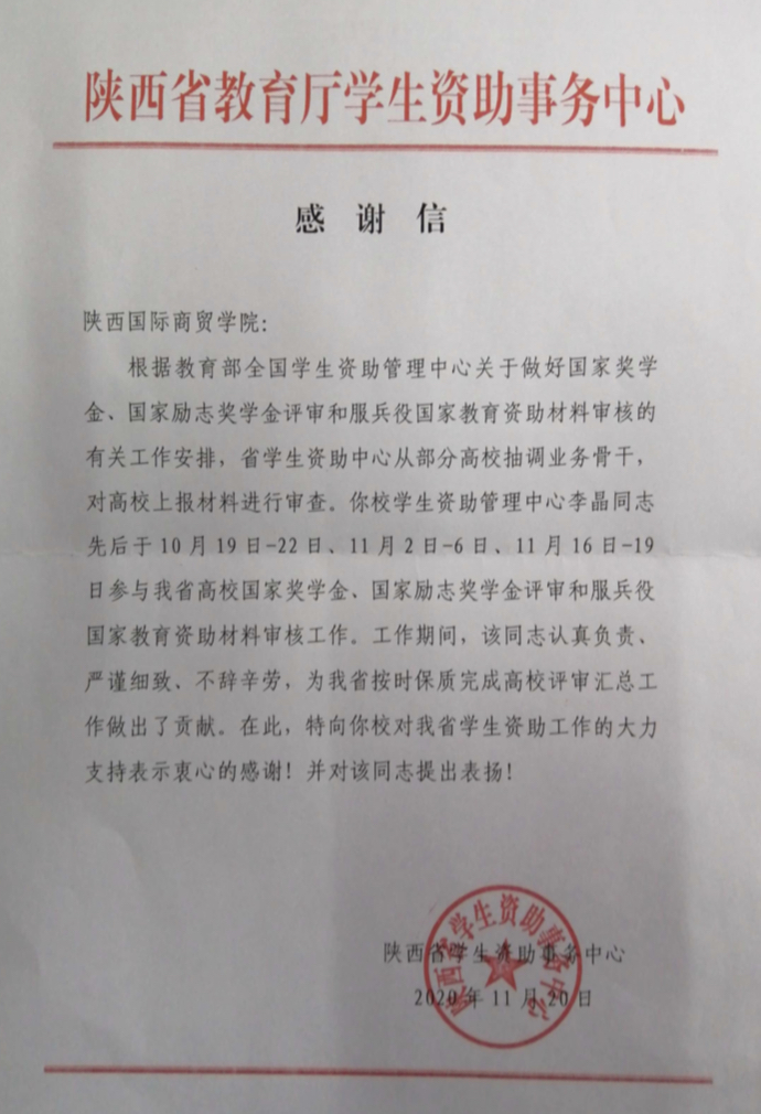 近日,陕西省教育厅学生资助管理中心发来感谢信,对我校支持省学生资助工作表示感谢,对我校学生资助管理中心李晶同志在被抽调期间的认真工作给与表扬。 李晶同志先后3次被抽调到省学生资助管理中心分别参与全省高校国家奖学金、国家励志奖学金和服兵役国家教育资助材料的审核工作,期间认真负责的工作作风受到肯定。该同志在我校从事学生资助管理工作10余年,工作作风务实,能够虚心学习和准确把握学生资助工作政策,认真负责地按...
